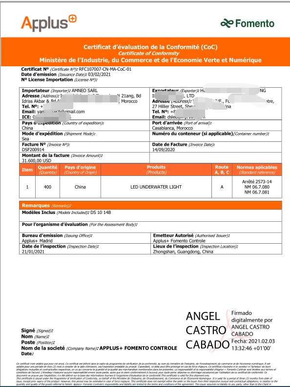 1. 根據產品的類別,驗證應在對應產品的出口國或目的國進行。所有受管制的產品必須獲得COC證書,才能順利清關,進入摩洛哥市場。